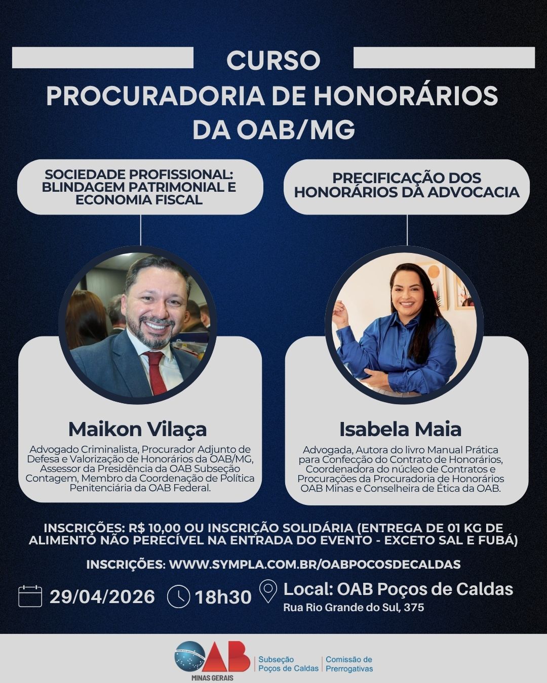 A OAB/MG realiza em Poços de Caldas o Curso da Advocacia Dativa na Prática.