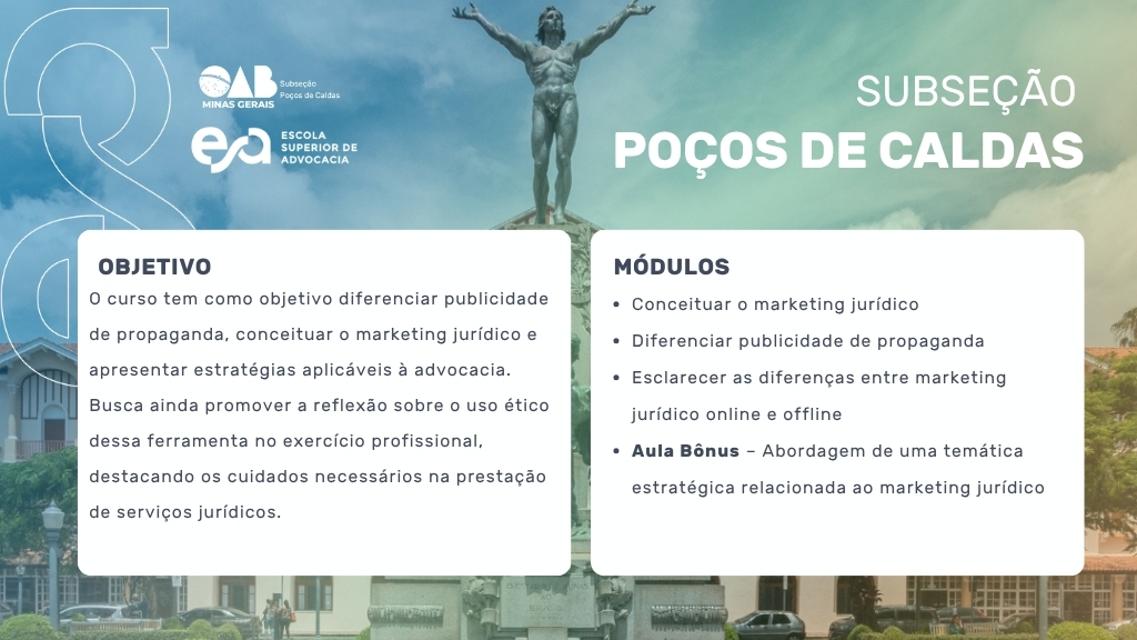 Em 23 de julho, a subseção de Poços de Caldas recebe o curso “Marketing Jurídico – part 1: no Online e Offline”, ministrado pela advogada Natália Araújo.