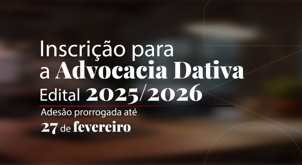 A OAB-MG informa que foi prorrogado o prazo das inscrições para a formação de lista da Advocacia Dativa, Edital 2025-2026, para a prestação de assistência judiciária à população hipossuficiente em Minas Gerais. O período de adesão será até 27 de fevereiro de 2026.
