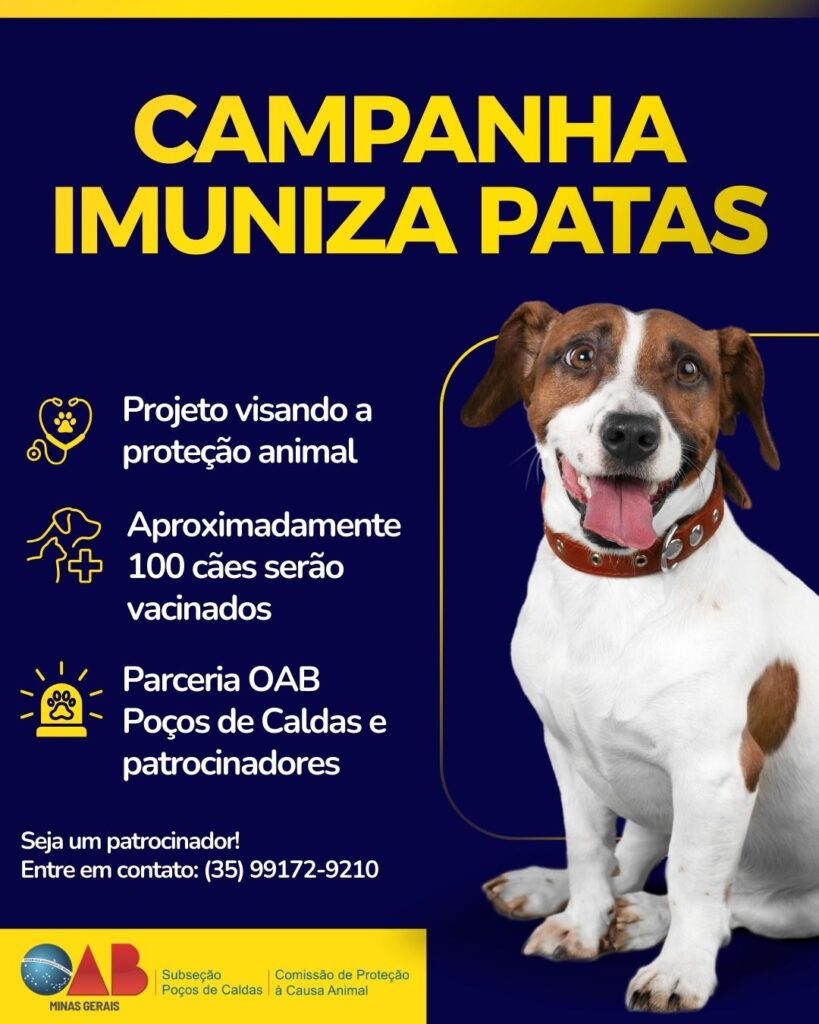 A Comissão de Proteção Animal da OAB Poços de Caldas, em parceria com apoiadores da causa animal, lança o projeto Imuniza Patas, com o objetivo de vacinar todos os cães do abrigo municipal de Poços de Caldas, com a vacina contra viroses, garantindo mais saúde, dignidade e qualidade de vida aos animais que aguardam uma nova chance!