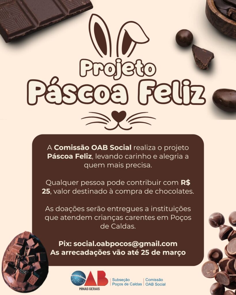A Comissão OAB Social convida você a participar dessa corrente do bem, levando chocolate, carinho e alegria às crianças atendidas por instituições de Poços de Caldas.