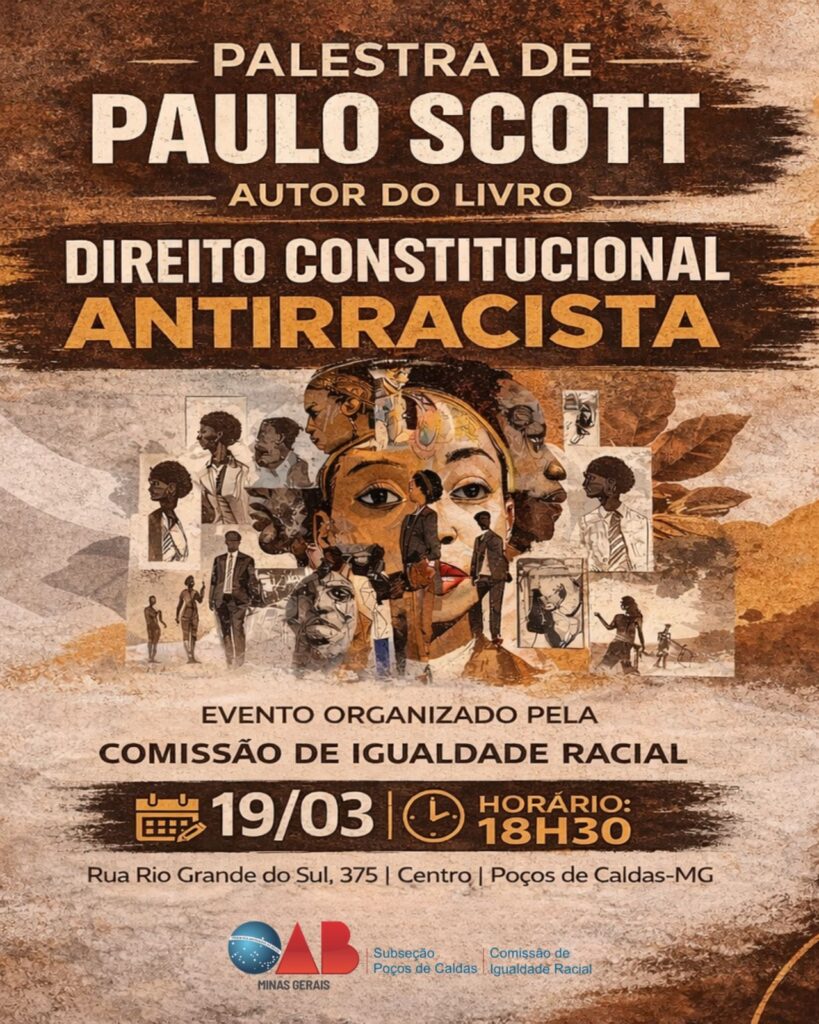 No dia 19/03, às 18h30, a comissão de Igualdade Racial da OAB/MG promove a palestra com Paulo Scott, autor da obra “Direito Constitucional Antirracista”.