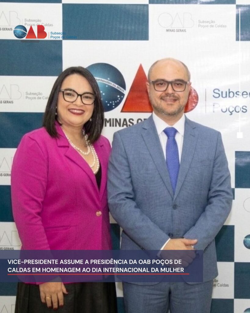 Em homenagem ao Dia Internacional da Mulher, o Presidente da OAB Poços de Caldas, Otacílio Andreatta Lemos, licencia-se do cargo no período de 08 a 13 de março de 2026, transferindo à Vice-Presidente, Aline Cristina de Oliveira, o exercício da Presidência da Subseção.