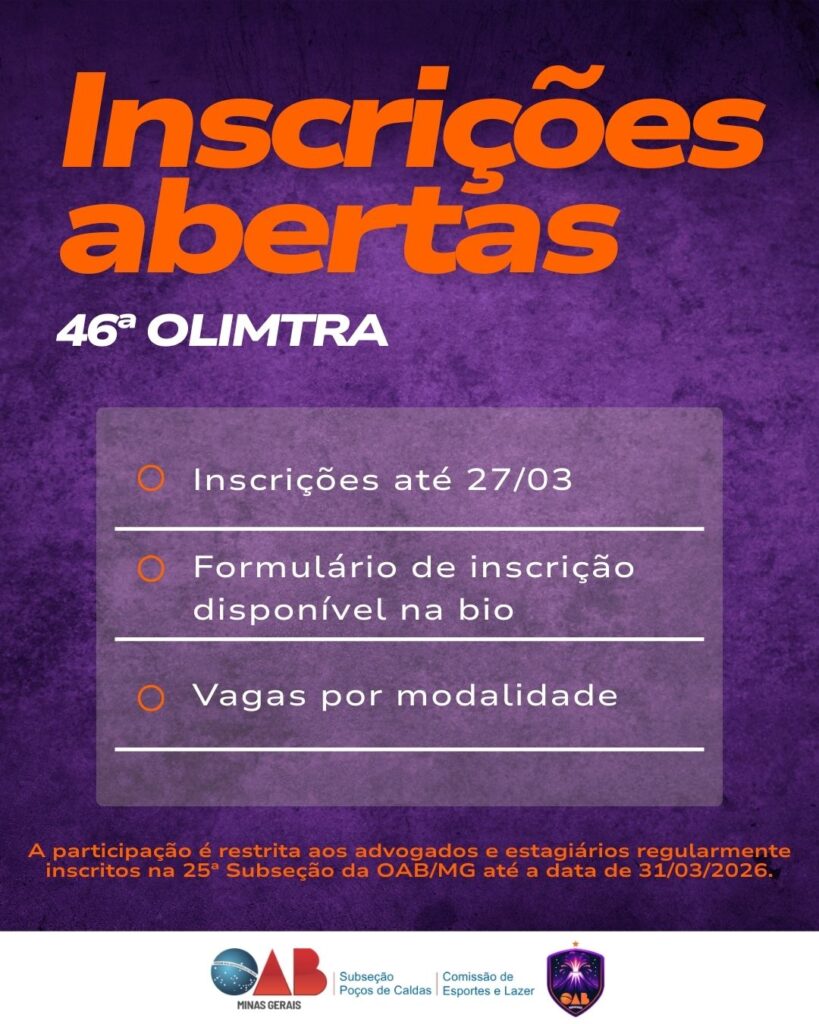 As inscrições para representar a OAB – Subseção Poços de Caldas – na 46ª edição da OLIMTRA (Olimpíada dos Trabalhadores), que acontecerá entre a última semana de abril até o final de maio, estão abertas!