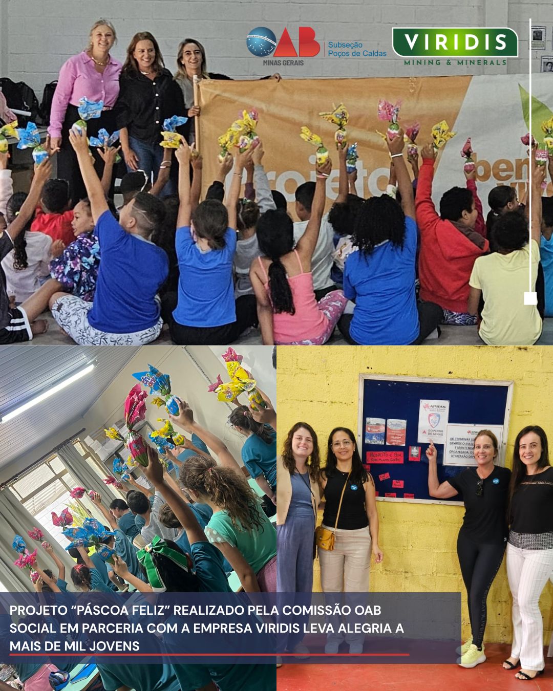 A Comissão OAB Social realizou o projeto “Páscoa Feliz”, beneficiando 1.040 crianças e adolescentes em diversas instituições: PMJ São José, PMJ João Monteiro, PMJ Vicentina Massa, PMJ Parque Pinheiro, APHAS, Bem Viver, Casa do Menor, Abrigo Filhos da Benção, Abrigo Fonte Vida, Abrigo Maia e Abrigo Fonte Vida Nova.